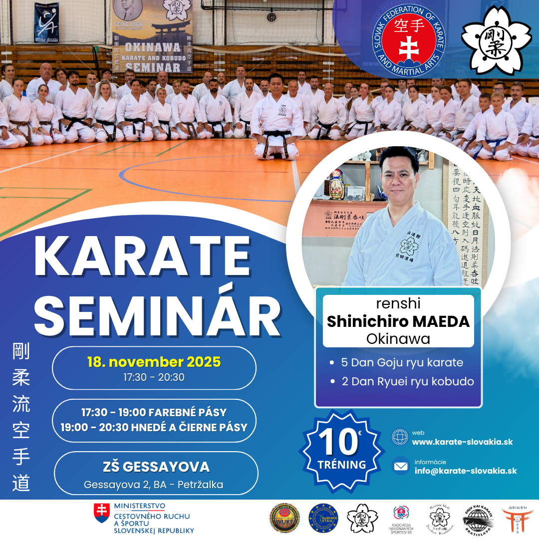 V utorok, 18.11.2025, sa v telocvčni na ZŠ Gessayova 2, Bratislava-Petržalka uskutoční seminár s našim okinawským učiteľom, renshi Shinichiro MAEDA, 5. Dan Goju ryu, 2. Dan kobudo.